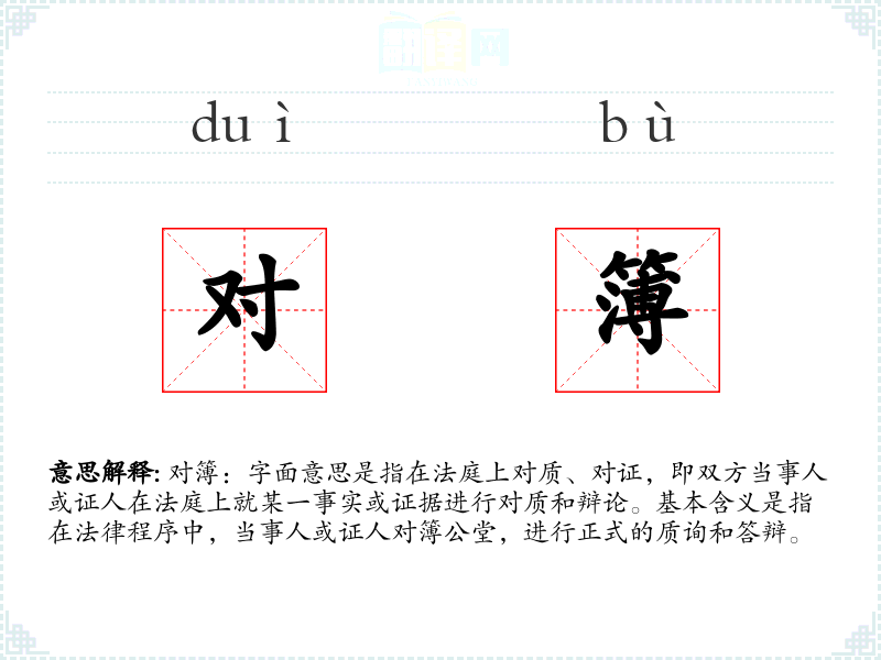 对簿:字面意思是指在法庭上对质、对证,即双方当事人或证人在法庭上就某一事实或证据进行对质和辩论。基本含义是指在法律程序中,当事人或证人对簿公堂,进行正式的质询和答辩。