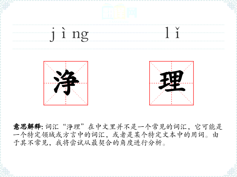 词汇“浄理”在中文里并不是一个常见的词汇,它可能是一个特定领域或方言中的词汇,或者是某个特定文本中的用词。由于其不常见,我将尝试从最契合的角度进行分析。