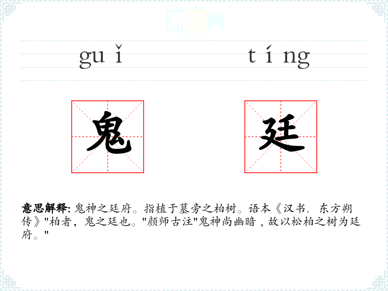 鬼神之廷府。指植于墓旁之柏树。语本《汉书.东方朔传》"柏者,鬼之廷也。"颜师古注"鬼神尚幽暗﹐故以松柏之树为廷府。"