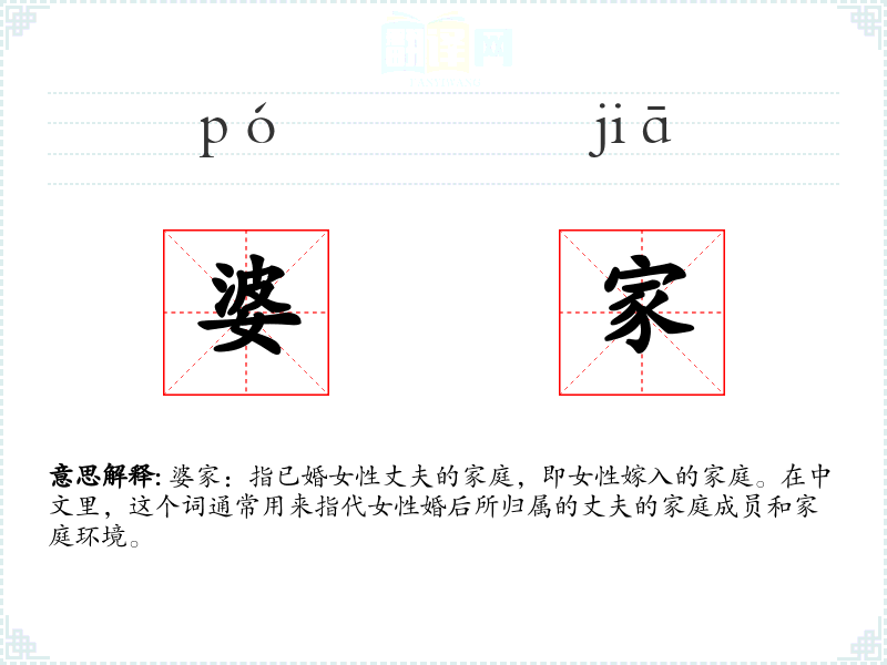 婆家:指已婚女性丈夫的家庭,即女性嫁入的家庭。在中文里,这个词通常用来指代女性婚后所归属的丈夫的家庭成员和家庭环境。