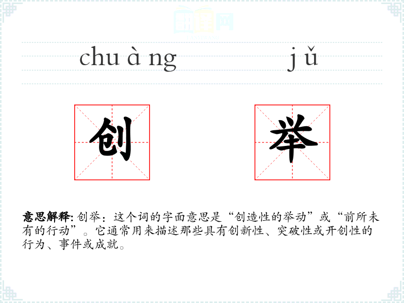 创举:这个词的字面意思是“创造性的举动”或“前所未有的行动”。它通常用来描述那些具有创新性、突破性或开创性的行为、**或成就。