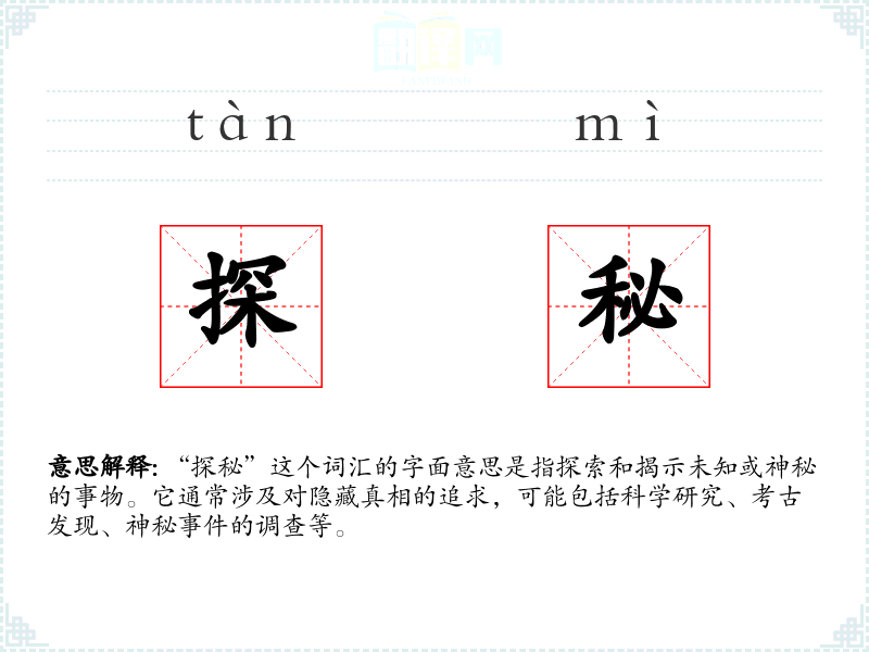 “探秘”由“探”和“秘”两个字组成。“探”字古汉语中意为伸出手去摸或试探,“秘”字则指秘密或不为人知的事物。随着语言的发展,“探秘”逐渐被用来描述对未知或神秘事物的探索行为。