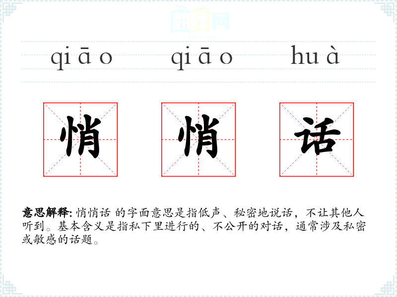 悄悄话 的字面意思是指低声、秘密地说话,不让其他人听到。基本含义是指私下里进行的、不公开的对话,通常涉及私密或敏感的话题。