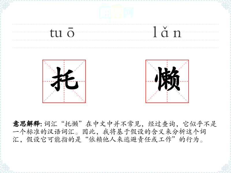 由于“托懒”不是一个标准词汇,其词源和演变难以考证。如果它是近年来网络或方言中产生的词汇,可能反映了社会对于责任逃避现象的一种新表达。