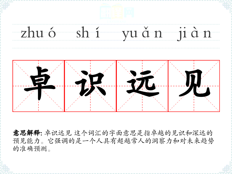 在英语中,卓识远见 可以对应为 "foresight" 或 "visionary",这些词汇在西方文化中也常用来形容具有远见的人。