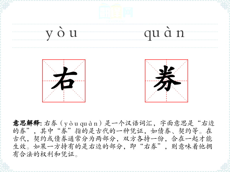 右券(yòu quàn)是一个汉语词汇,字面意思是“右边的券”,其中“券”指的是古代的一种凭证,如债券、契约等。在古代,契约或债券通常分为两部分,双方各持一份,合在一起才能生效。如果一方持有的是右边的部分,即“右券”,则意味着他拥有合法的权利和凭证。