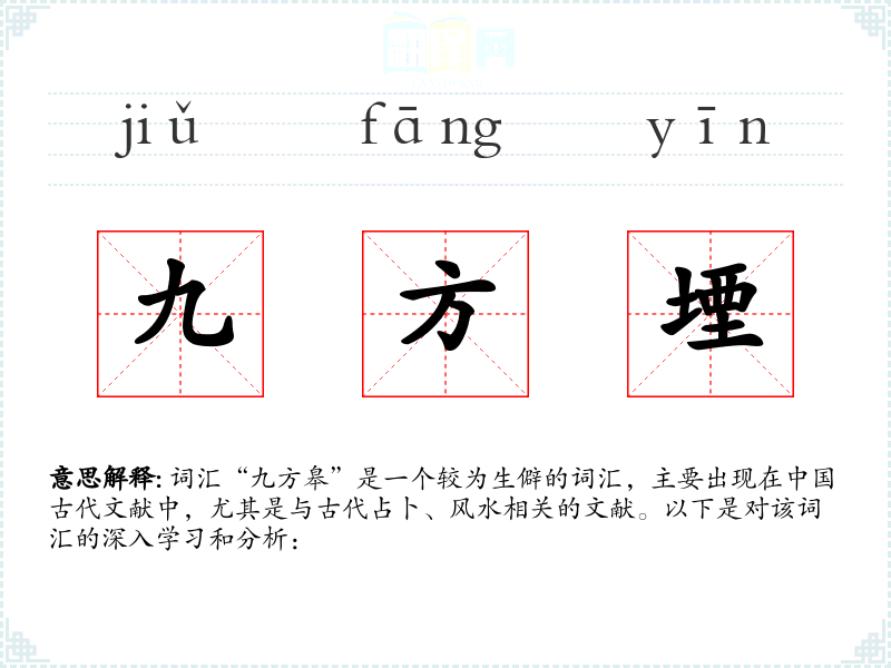 词汇“九方皋”是一个较为生僻的词汇,主要出现在*古代文献中,尤其是与古代占卜、风水相关的文献。以下是对该词汇的深入学和分析: