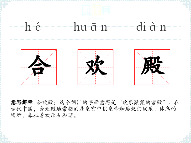 合欢殿:这个词汇的字面意思是“欢乐聚集的宫殿”。在古代,合欢殿通常指的是皇宫中供和后妃们娱乐、休息的场所,象征着欢乐和和谐。