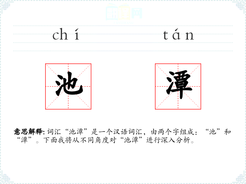 “池”字最早见于甲骨文,原意为人工挖掘的水池。“潭”字则较晚出现,原意为深水池。两者结合,强调了水体的深度和自然状态。