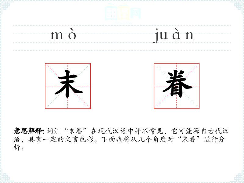 词汇“末眷”在现代汉语中并不常见,它可能源自古代汉语,具有一定的文言色彩。下面我将从几个角度对“末眷”进行分析: