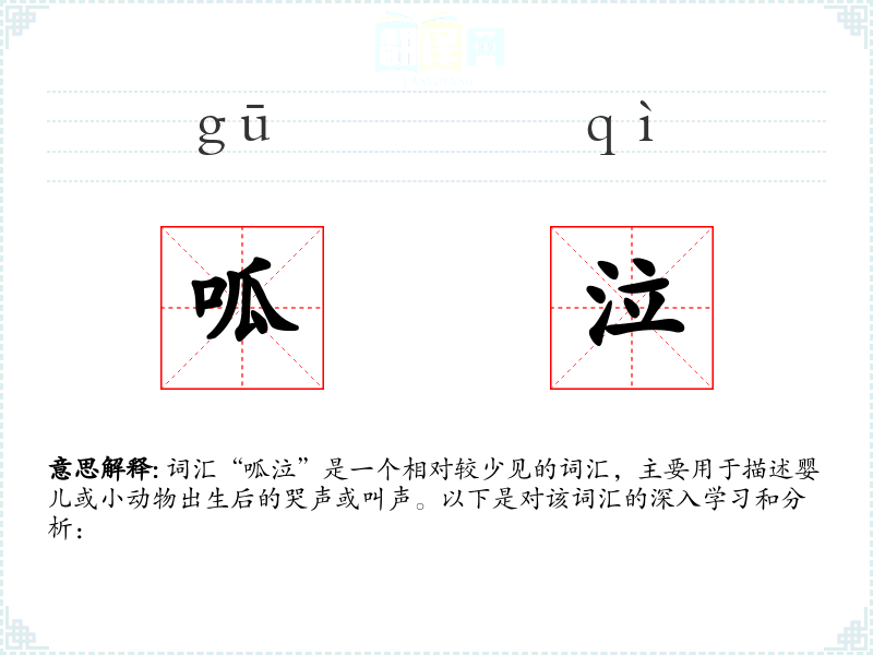 - 字面意思:“呱泣”由两个字组成,“呱”通常指小动物或婴儿的叫声,“泣”则指哭泣或哭声。