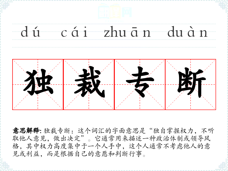 **专断:这个词汇的字面意思是“独自掌握权力,不听取他人意见,做出决定”。它通常用来描述一种政治体制或领导风格,其中权力高度集中于一个人手中,这个人通常不考虑他人的意见或利益,而是根据自己的意愿和判断行事。