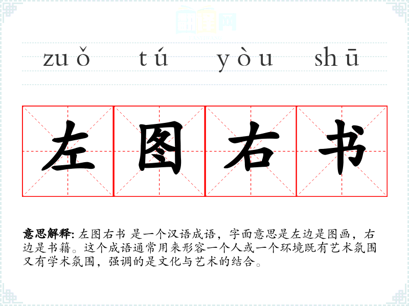 左图右书 是一个汉语成语,字面意思是左边是图画,右边是书籍。这个成语通常用来形容一个人或一个环境既有艺术氛围又有学术氛围,强调的是文化与艺术的结合。