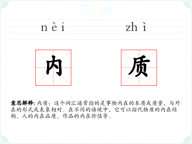 内质:这个词汇通常指的是事物内在的本质或质量,与外在的形式或表象相对。在不同的语境中,它可以指代物质的内在结构、人的内在品质、作品的内在价值等。