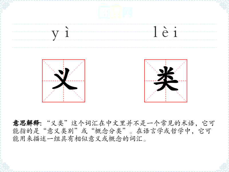 “义类”这个词汇在中文中并没有特别古老的词源,它可能是现代学术语言中的一个合成词,由“义”(意义)和“类”(类别)组合而成。