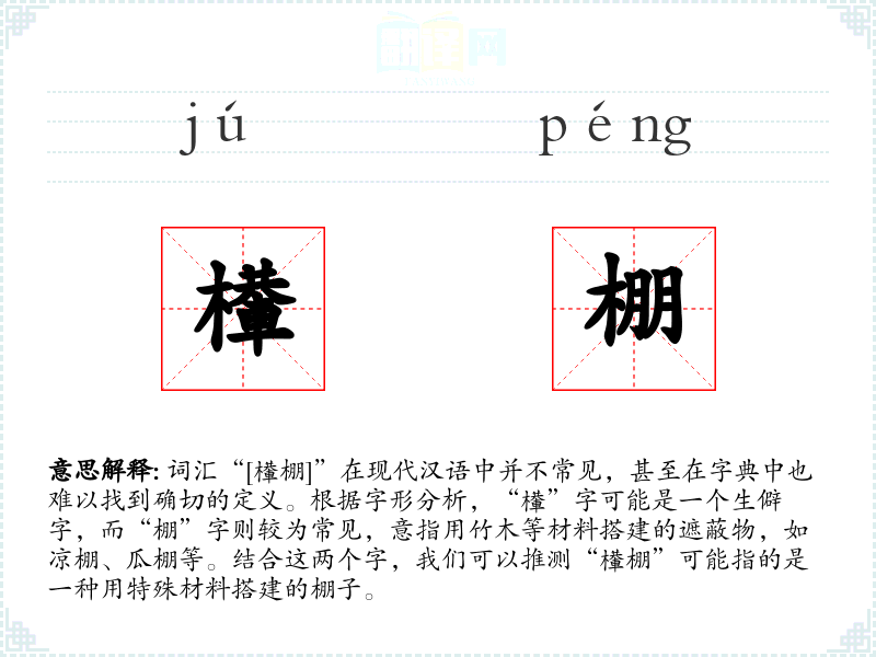 - 对该词汇的理解:“檋棚”是一个生僻词汇,其具体含义和用法不明确,因此在语言学习和表达中的重要性有限。