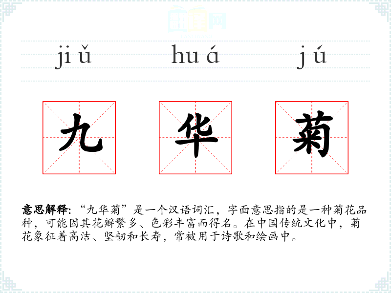 - 反义词:(由于“九华菊”特指一种菊花,反义词不适用)