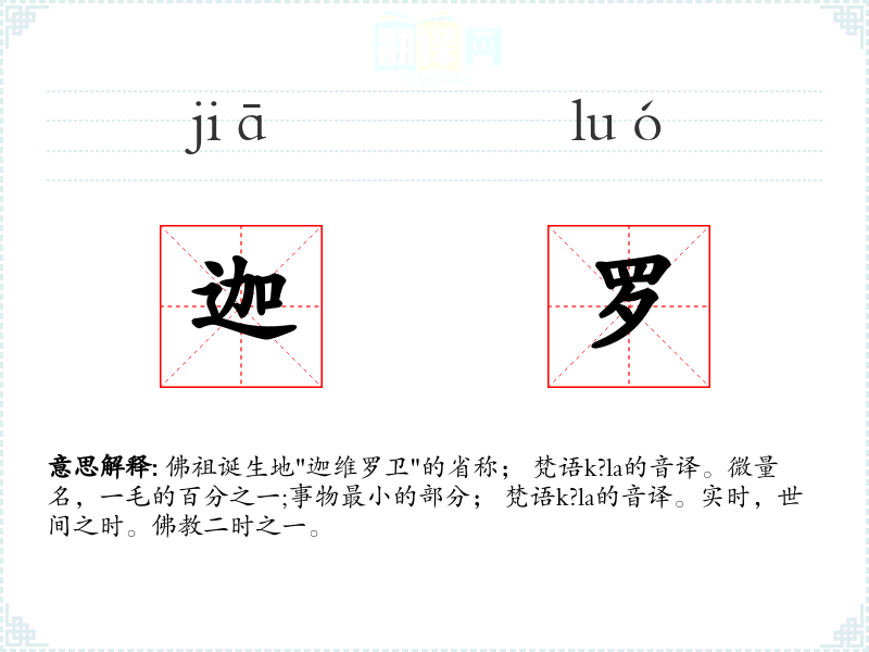 佛祖诞生地"迦维罗卫"的省称; 梵语k?la的音译。微量名,一毛的百分之一;事物最小的部分; 梵语k?la的音译。实时,世间之时。佛教二时之一。