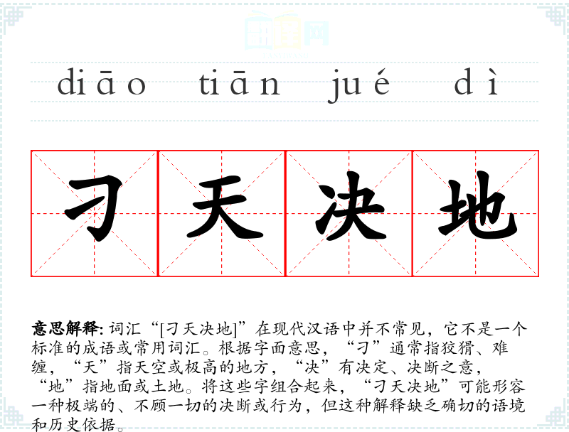 由于“刁天决地”不是一个标准词汇,我们无法给出确切的基本定义。它可能是某个方言中的表达,或者是某个特定社群中的俚语。