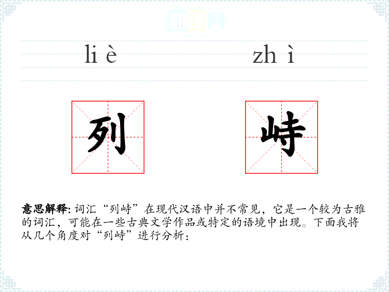 词汇“列峙”在现代汉语中并不常见,它是一个较为古雅的词汇,可能在一些古典文学作品或特定的语境中出现。下面我将从几个角度对“列峙”进行分析: