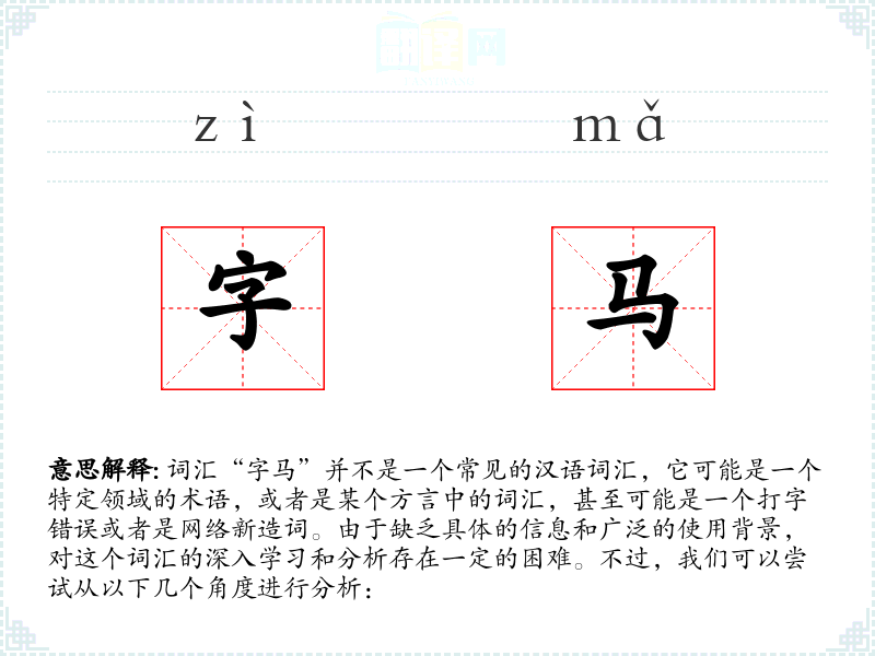 由于“字马”不是一个标准汉语词汇,我们无法给出确切的字面意思和基本含义。如果这是一个特定领域的术语,可能需要查阅相关领域的专业资料来获取定义。