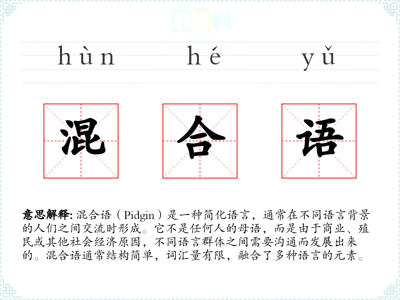 混合语(Pidgin)是一种简化语言,通常在不同语言背景的人们之间交流时形成。它不是任何人的母语,而是由于商业、殖民或其他社会经济原因,不同语言群体之间需要沟通而发展出来的。混合语通常结构简单,词汇量有限,融合了多种语言的元素。