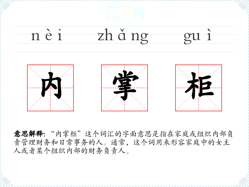 “内掌柜”这个词汇的字面意思是指在家庭或组织内部负责管理财务和日常事务的人。通常,这个词用来形容家庭中的女主人或者某个组织内部的财务负责人。