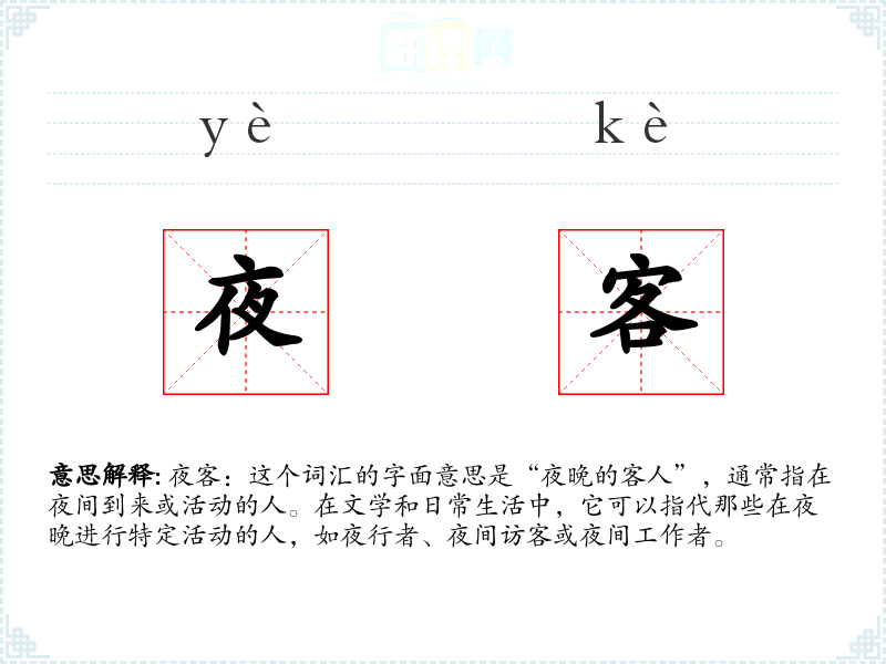 夜客:这个词汇的字面意思是“夜晚的客人”,通常指在夜间到来或活动的人。在文学和日常生活中,它可以指代那些在夜晚进行特定活动的人,如夜行者、夜间访客或夜间工作者。
