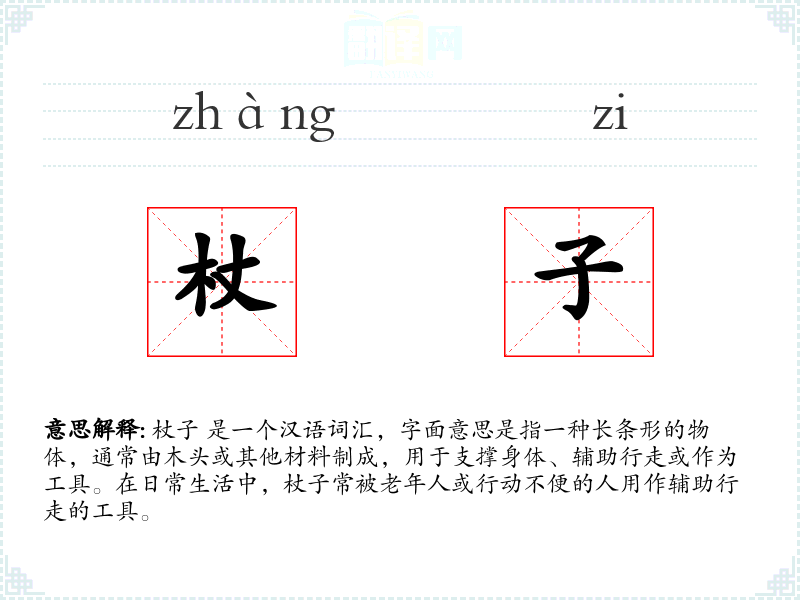 - 口语:在日常口语中,杖子可能简单地指代拐杖或手杖。例如,“他走路需要一根杖子。”