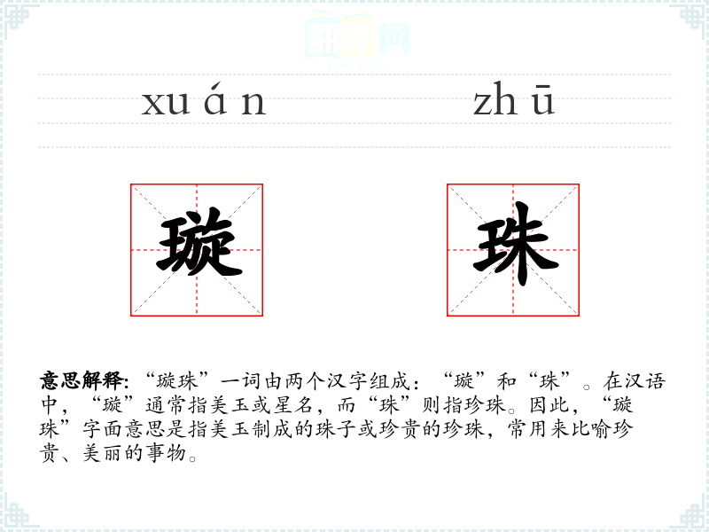 - 反义词:瓦砾、石块(这些词与“璇珠”形成鲜明对比,表示不值钱或不珍贵的事物)
