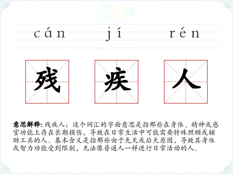 残疾人:这个词汇的字面意思是指那些在身体、精神或感官功能上存在长期损伤,导致在日常生活中可能需要特殊照顾或辅助工具的人。基本含义是指那些由于先天或后天原因,导致其身体或智力功能受到限制,无法像普通人一样进行日常活动的人。