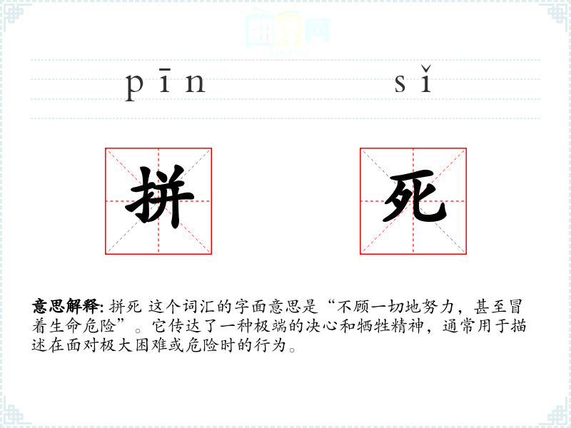 拼死 这个词汇的字面意思是“不顾一切地努力,甚至冒着生命危险”。它传达了一种极端的决心和牺牲精神,通常用于描述在面对极大困难或危险时的行为。