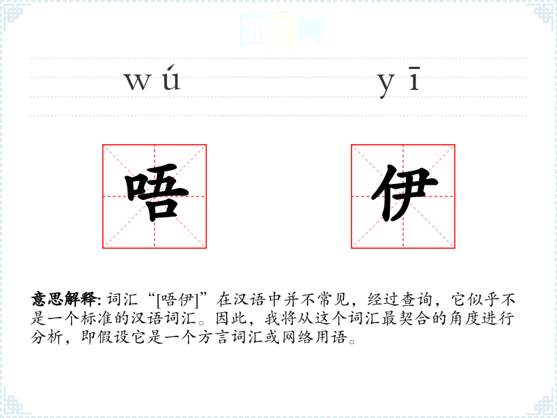 词汇“[唔伊]”在汉语中并不常见,经过查询,它似乎不是一个标准的汉语词汇。因此,我将从这个词汇最契合的角度进行分析,即假设它是一个方言词汇或网络用语。