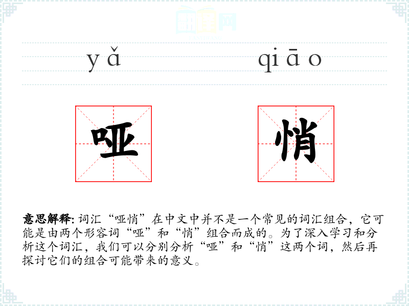 词汇“哑悄”在中文中并不是一个常见的词汇组合,它可能是由两个形容词“哑”和“悄”组合而成的。为了深入学习和分析这个词汇,我们可以分别分析“哑”和“悄”这两个词,然后再探讨它们的组合可能带来的意义。