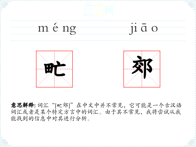 词汇“[甿郊]”在中文中并不常见,它可能是一个古汉语词汇或者是某个特定方言中的词汇。由于其不常见,我将尝试从我能找到的信息中对其进行分析。