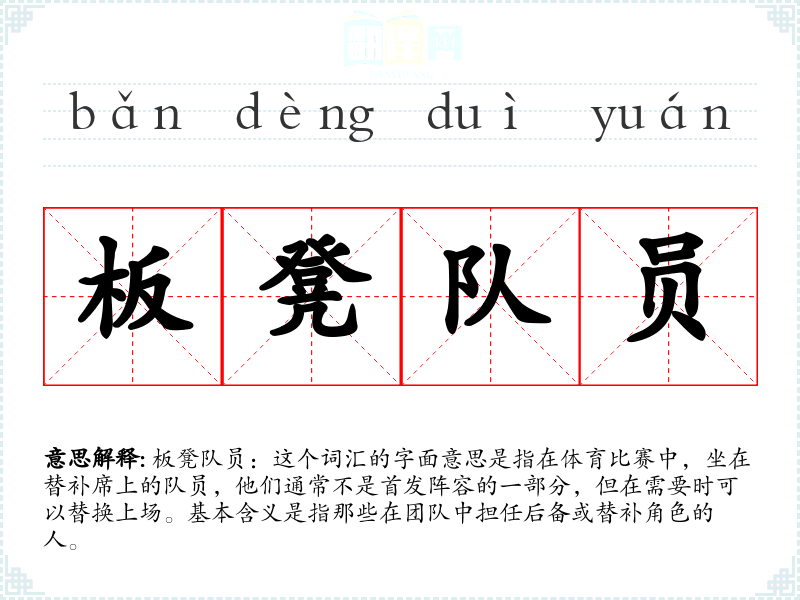 板凳队员:这个词汇的字面意思是指在体育比赛中,坐在替补席上的队员,他们通常不是首发阵容的一部分,但在需要时可以替换上场。基本含义是指那些在团队中担任后备或替补角色的人。