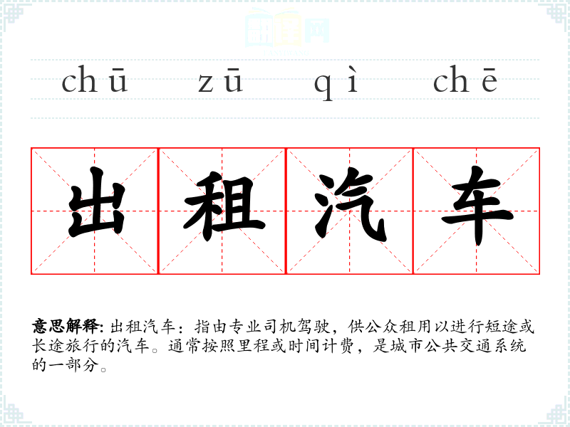 "出租汽车"的意思解释、出租汽车是什么意思由翻译网汉语词典查词提供。
