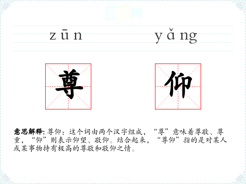 - 对应词汇:在英语中,“尊仰”可以对应为“reverence”或“admiration”,虽然这些词在细微含义上有所不同,但都表达了尊敬和敬仰的情感。