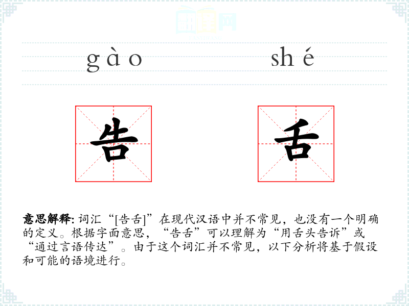 词汇“[告舌]”在现代汉语中并不常见,也没有一个明确的定义。根据字面意思,“告舌”可以理解为“用舌头告诉”或“通过言语传达”。由于这个词汇并不常见,以下分析将基于假设和可能的语境进行。