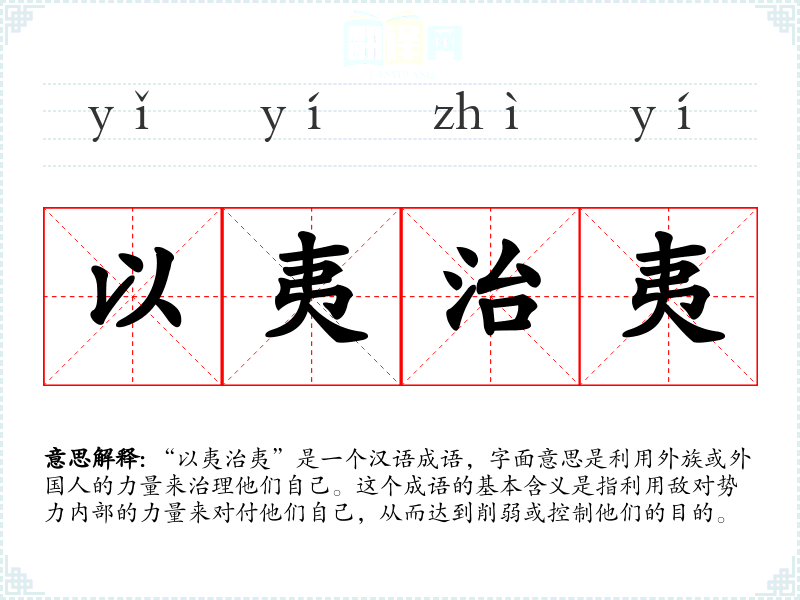 “以夷治夷”是一个汉语成语,字面意思是利用外族或外国人的力量来治理他们自己。这个成语的基本含义是指利用敌对势力内部的力量来对付他们自己,从而达到削弱或控制他们的目的。