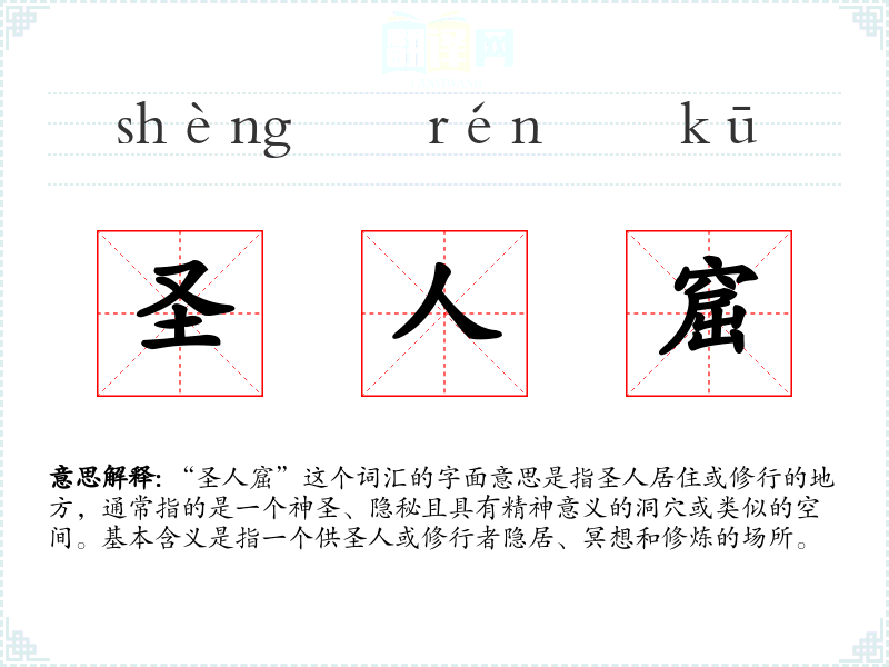 “圣人窟”这个词汇的字面意思是指圣人居住或修行的地方,通常指的是一个神圣、隐秘且具有精神意义的洞穴或类似的空间。基本含义是指一个供圣人或修行者隐居、冥想和修炼的场所。