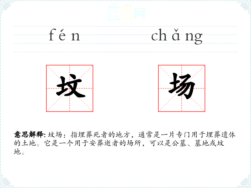 - 词源:“坟场”一词由“坟”和“场”组成,“坟”指埋葬死者的土堆,“场”指一片地方。