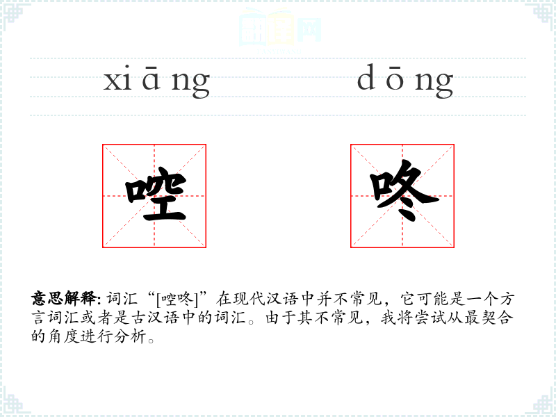 词汇“[啌咚]”在现代汉语中并不常见,它可能是一个方言词汇或者是古汉语中的词汇。由于其不常见,我将尝试从最契合的角度进行分析。