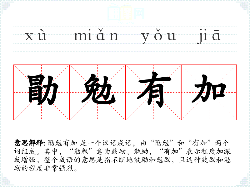 勖勉有加 是一个汉语成语,由“勖勉”和“有加”两个词组成。其中,“勖勉”意为鼓励、勉励,“有加”表示程度加深或增强。整个成语的意思是指不断地鼓励和勉励,且这种鼓励和勉励的程度非常强烈。