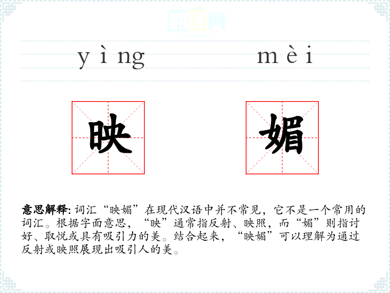 词汇“映媚”在现代汉语中并不常见,它不是一个常用的词汇。根据字面意思,“映”通常指反射、映照,而“媚”则指讨好、取悦或具有吸引力的美。结合起来,“映媚”可以理解为通过反射或映照展现出吸引人的美。