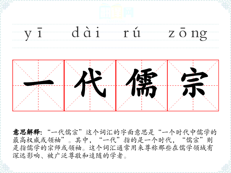 “一代儒宗”这个词汇的字面意思是“一个时代中儒学的最高权威或领袖”。其中,“一代”指的是一个时代,“儒宗”则是指儒学的宗师或领袖。这个词汇通常用来尊称那些在儒学领域有深远影响、被广泛尊敬和追随的学者。