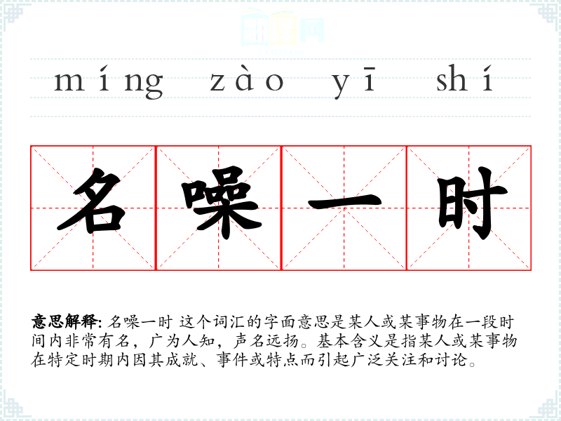 名噪一时 这个词汇的字面意思是某人或某事物在一段时间内非常有名,广为人知,声名远扬。基本含义是指某人或某事物在特定时期内因其成就、**或特点而引起广泛关注和讨论。