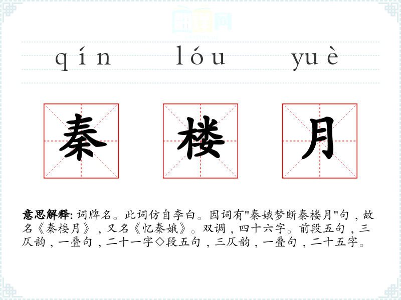 词牌名。此词仿自李白。因词有"秦娥梦断秦楼月"句﹐故名《秦楼月》﹐又名《忆秦娥》。双调﹐四十六字。前段五句﹐三仄韵﹐一叠句﹐二十一字◇段五句﹐三仄韵﹐一叠句﹐二十五字。