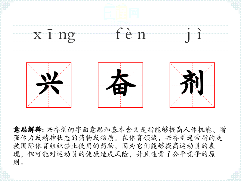 兴奋剂的字面意思和基本含义是指能够提高人体机能、增强体力或精神状态的药物或物质。在体育领域,兴奋剂通常指的是被国际体育组织禁止使用的药物,因为它们能够提高员的表现,但可能对员的健康造成风险,并且违背了公平竞争的原则。