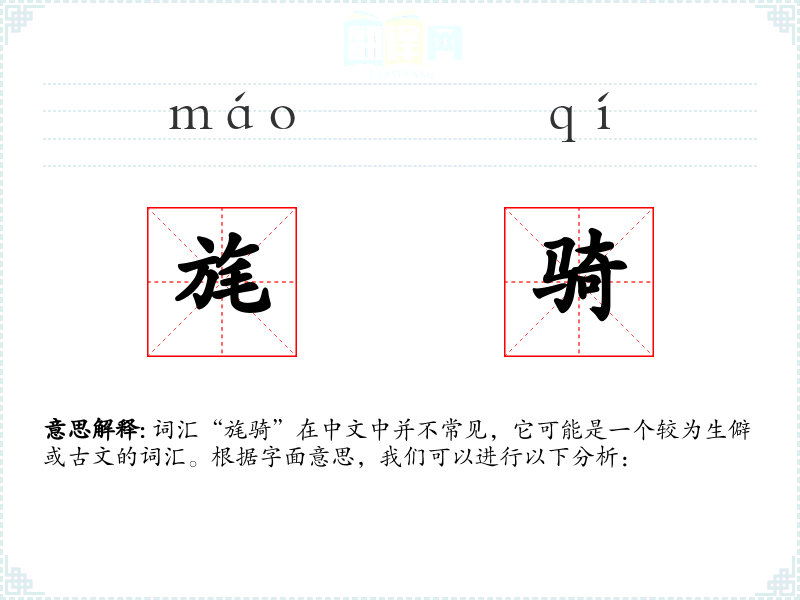 词汇“旄骑”在中文中并不常见,它可能是一个较为生僻或古文的词汇。根据字面意思,我们可以进行以下分析: